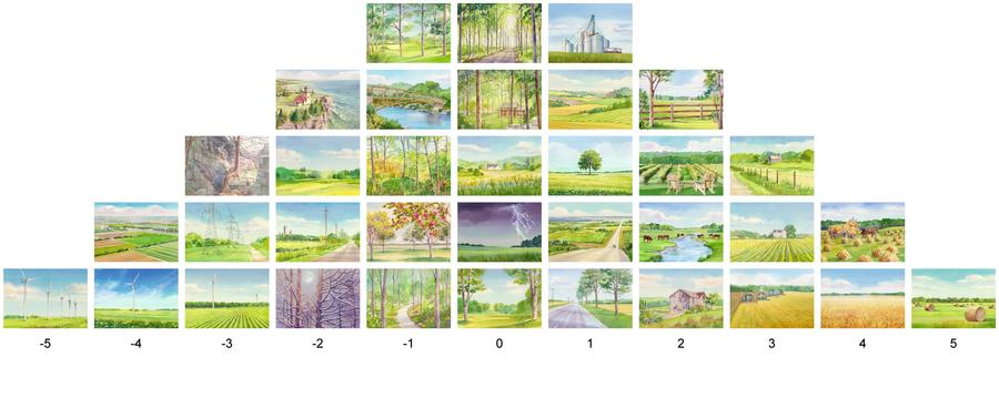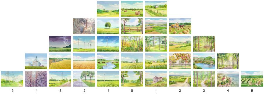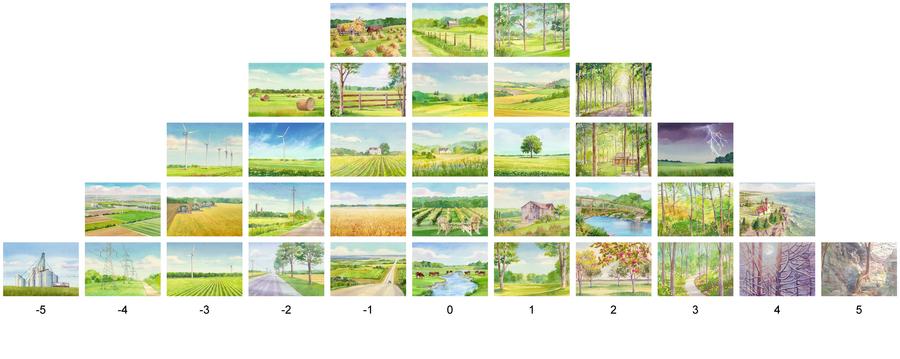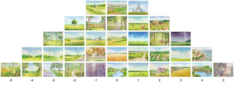 Thirty-five watercolour paintings were created by reviewing and synthesizing an extensive collection of imagery that was gathered by observing landscape imagery valued by citizens in the case study area; this consisted of artwork, photography, advertising material or online reproductions of landscapes that were created, collected, displayed or shared by residents. A diverse group of 82 participants ranked the images in order of preference (most prefer to least prefer) in a Q-sort pyramid.