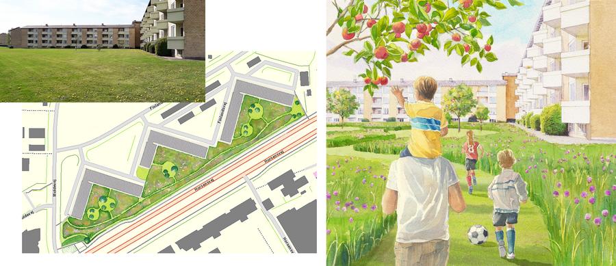 A new orchard and meadow plantings with mown paths adds beauty and productivity to the courtyards of this municipal housing project.