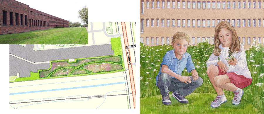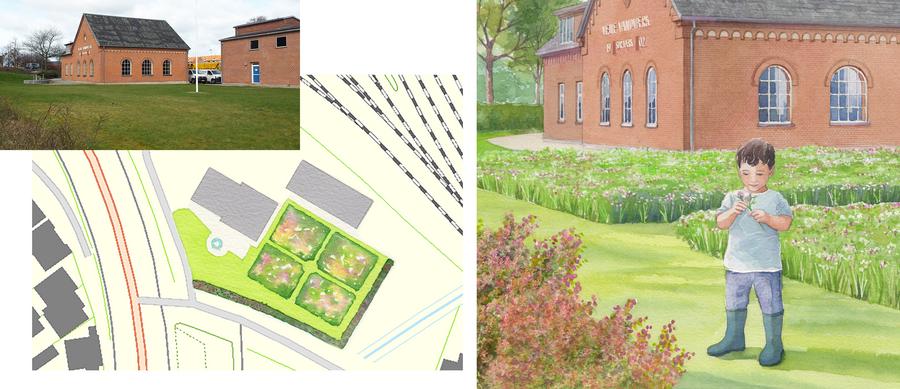 Working with the community advocacy group “The Butterfly Movement”, Christine used a “Before”and After” illustration technique to create landscape plans and scenarios to encourage the conversion of underused municipal lawns to pollinator meadows in Vejle, Denmark.